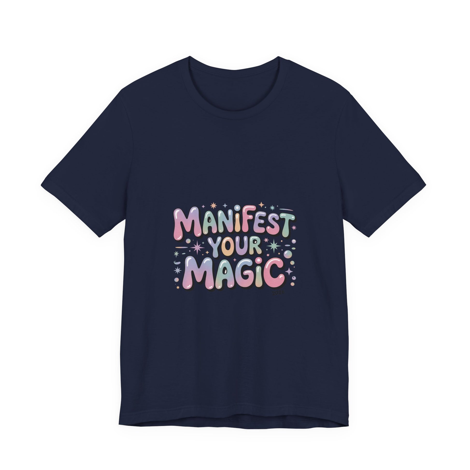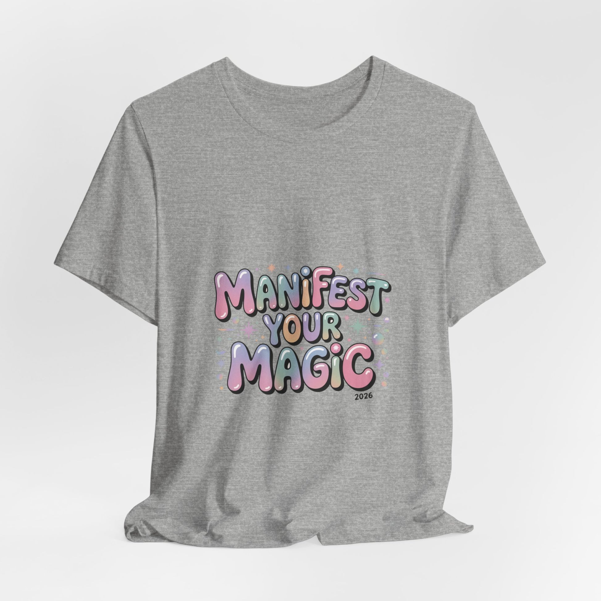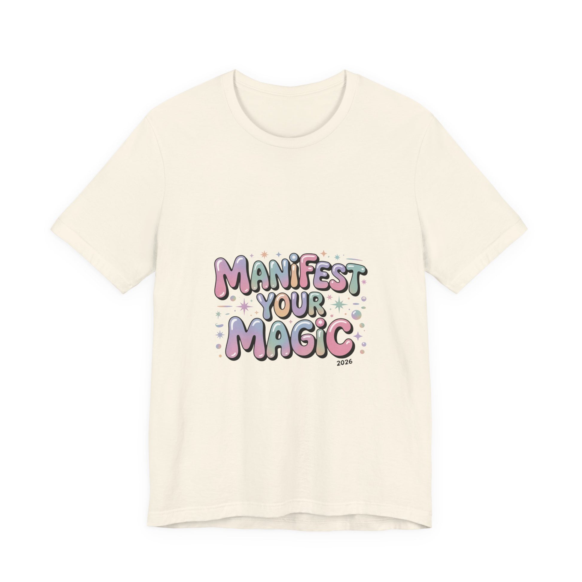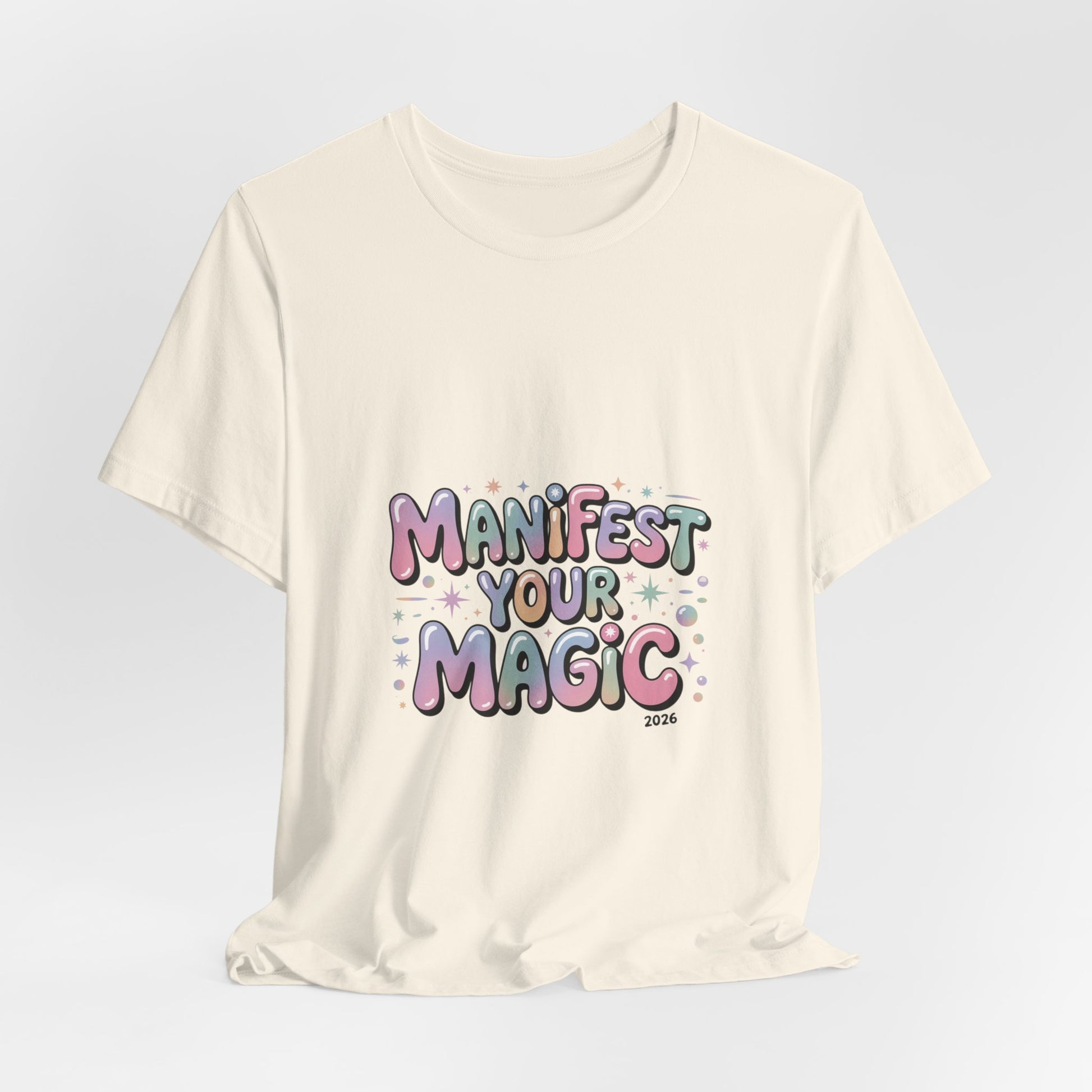 Soft, pastel charm tee that reads like a wearable mantra for the Lucky Girl 2026 trend. Playful bubble lettering says “Manifest Your Magic” in glowy pinks, lavenders and mint with tiny sparkle and charm motifs—a casual, optimistic piece that layers under jackets or stands alone during festive end-of-year moments. The vibe matches manifest-luck searches and upbeat, feminine aesthetics without using any trademarked names. Product features - 100% Airlume combed and ring-spun cotton (Bella+Canvas 3001) - With side seams for added shape retention - Ribbed knit collar with seam and shoulder tape for stability - Sleeve and neck label prints produced with DTF/DTG techniques - Tear-away label; REACH certified; sourced from Honduras Care instructions - Machine wash: cold (max 30C or 90F) - Non-chlorine: bleach as needed - Tumble dry: low heat - Iron, steam or dry: medium heat - Do not dryclean